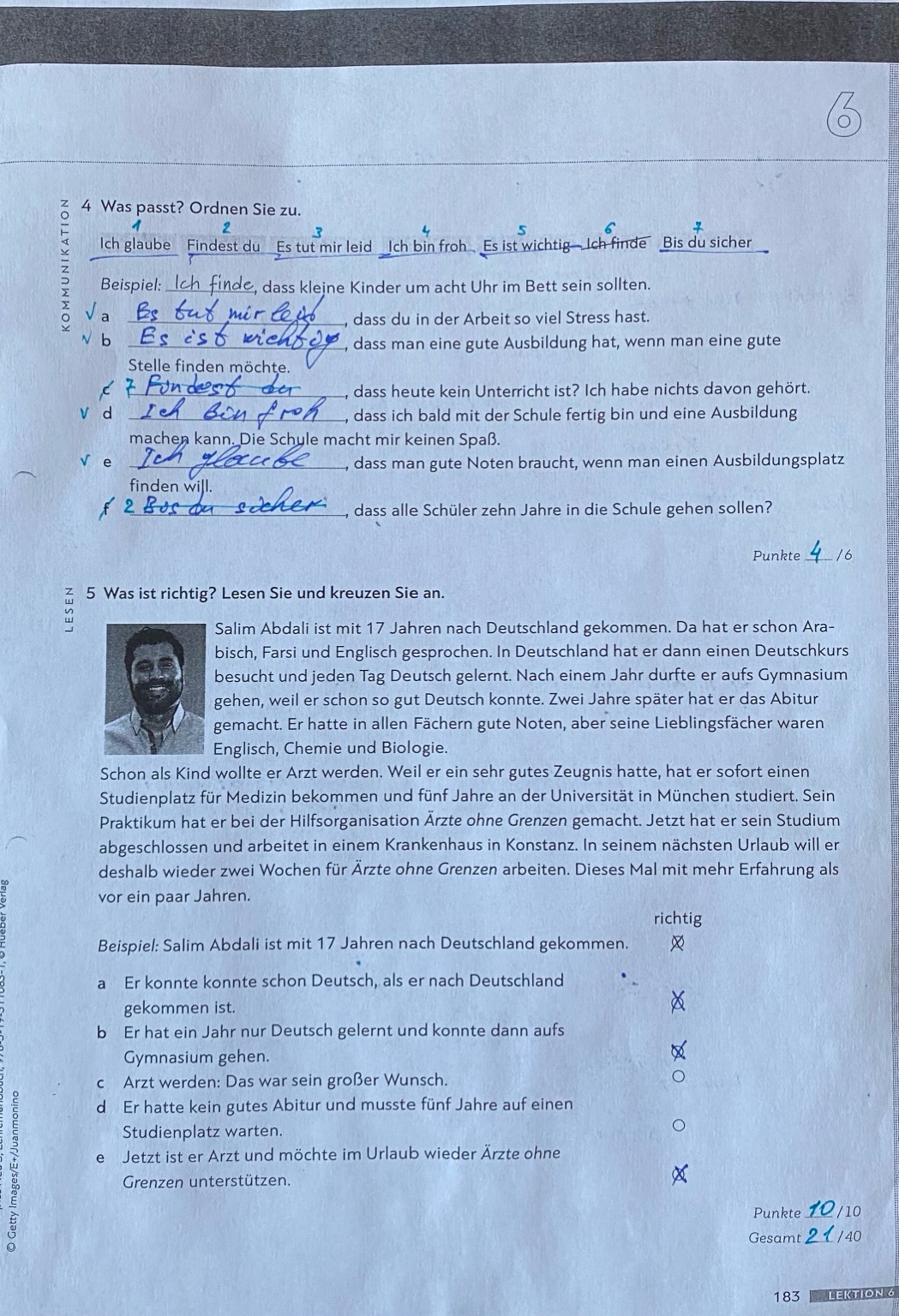 | e) Jetzt ist er Arzt und möchte im Urlaub wieder Ärzte ohne Grenzen unterstützen. | e) Зараз він лікар і хоче знову підтримати «Лікарів без кордонів» під час відпустки. |